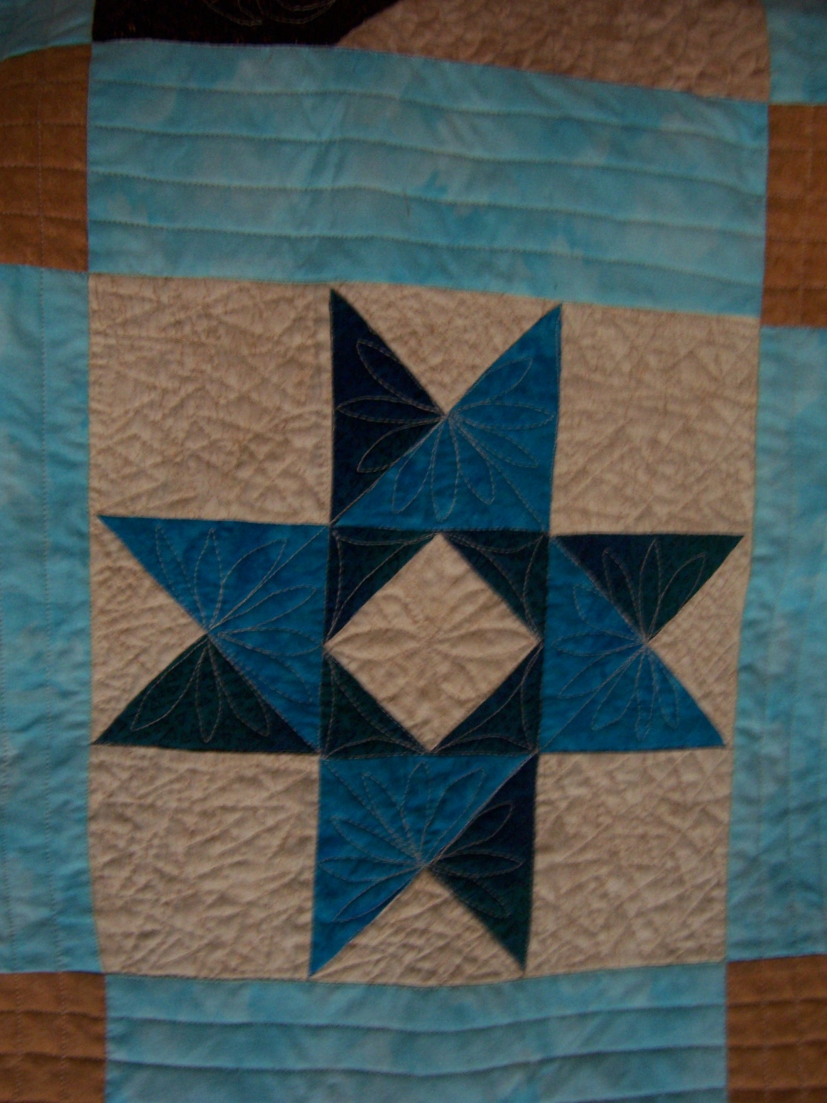 I decided to try different quilting patterns on the various blocks. All was done free motion quilting...no marking whatsoever.